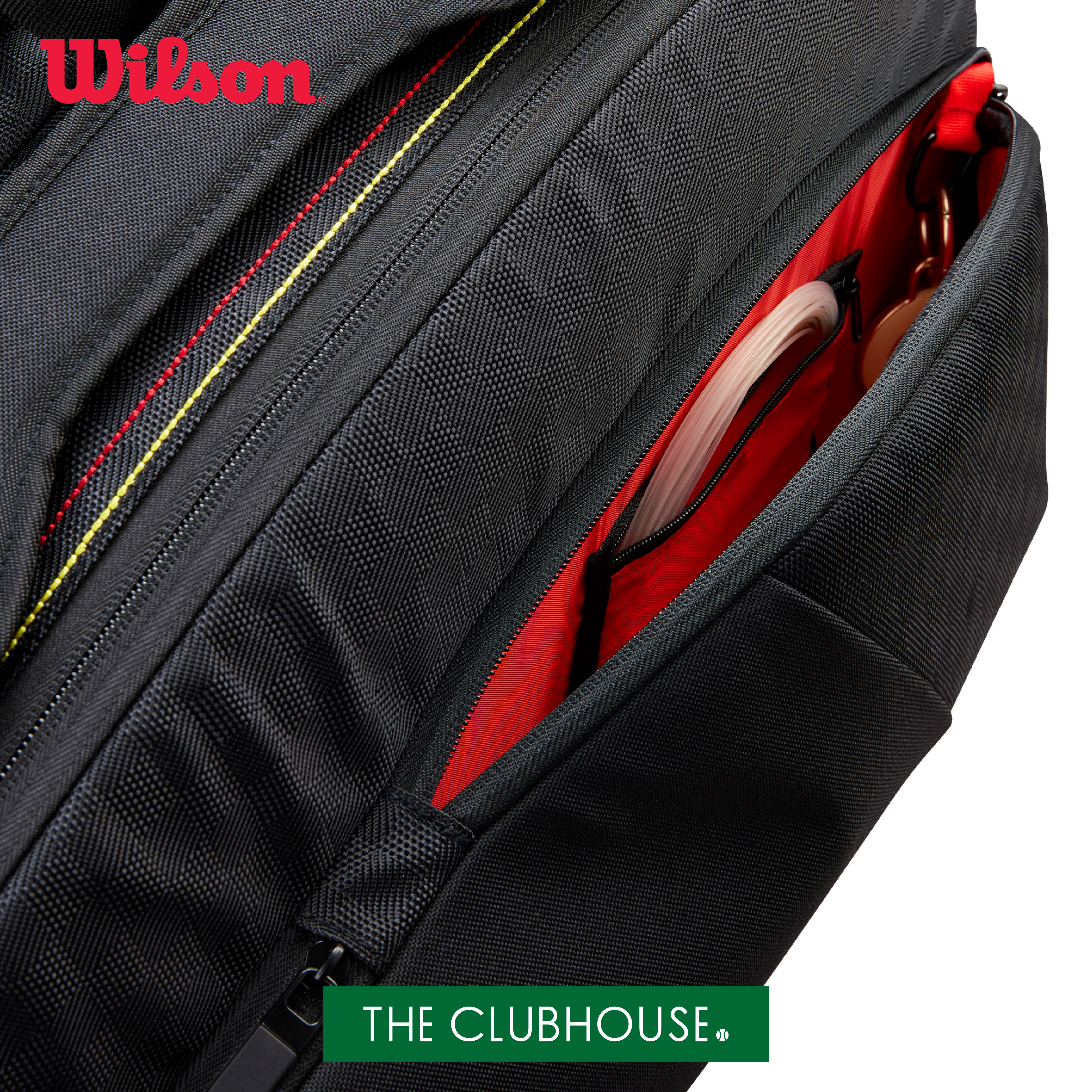 ラケットや衣類の収納に適したメイン収納部は2室構造で、ラケットを最大6本まで収納可能。両面のフロント部には小物を整理しやすいジッパー付きポケットを配置し、前面には貴重品の収納に最適なジッパー付きポケットもあり。無駄を削ぎ落としたブラックベースのデザインに、レッドロゴとラインが映える、PRO STAFFのDNAを感じさせる佇まい。機能性と存在感を両立した、コートでも移動中でも映えるラケットバッグ。
